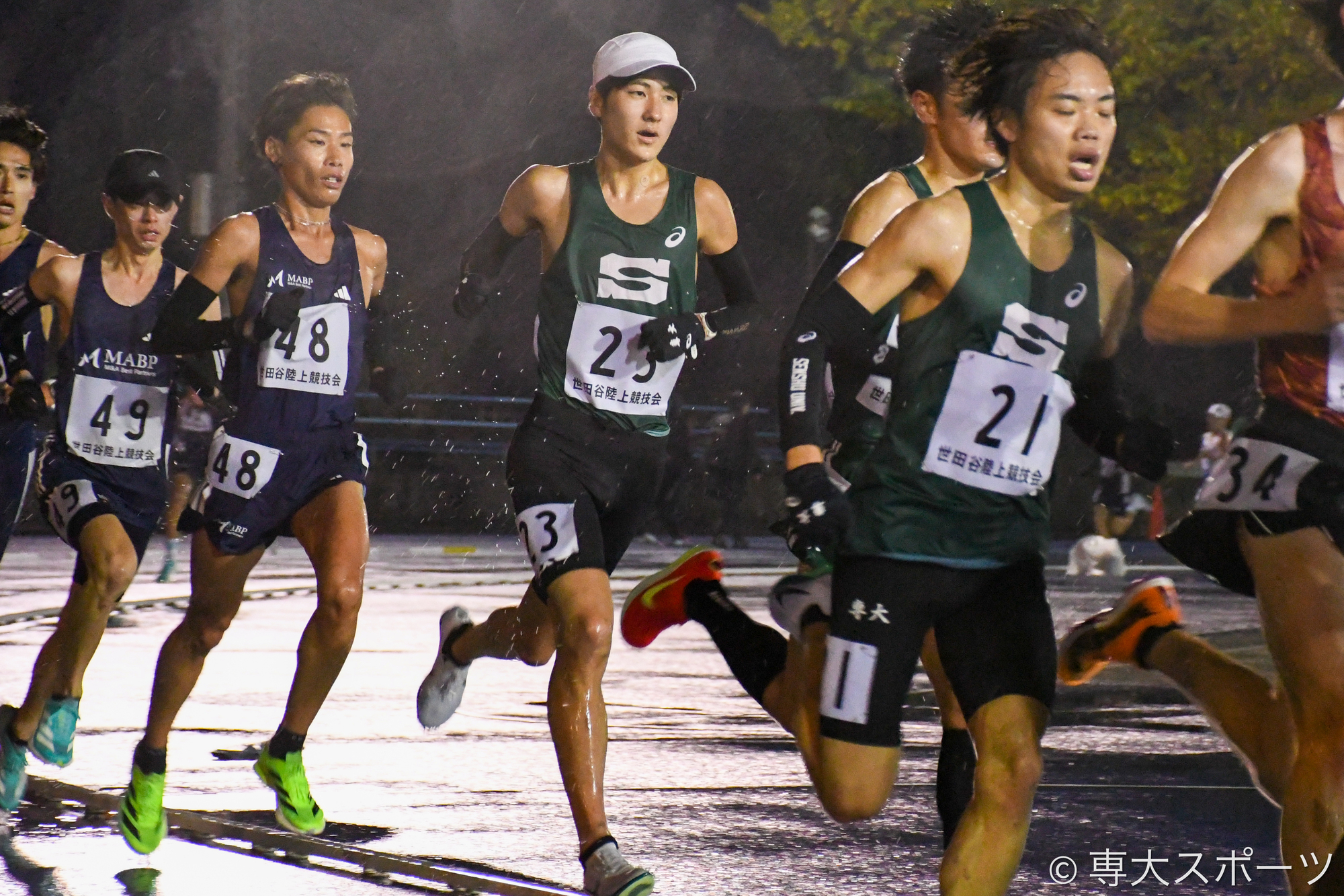 小雨が降る中で行われた世田谷陸上競技会に専大からは29名が出場。今季最後のレースとなる中10名が自己記録を更新した。専大から最多出場となった7組でチーム内1番手となったのは西岳正宗(法2・県立玉名高)。28分台にせまる29分12秒37をマークし、自己ベストを1分以上更新した。続く2番手には西広翔(経営1・専大松戸高)がフィニッシュ。29分21秒54で記録をさらに上書きした。しかし、新たに28分台に到達する選手は現れず、課題が残る結果となった。