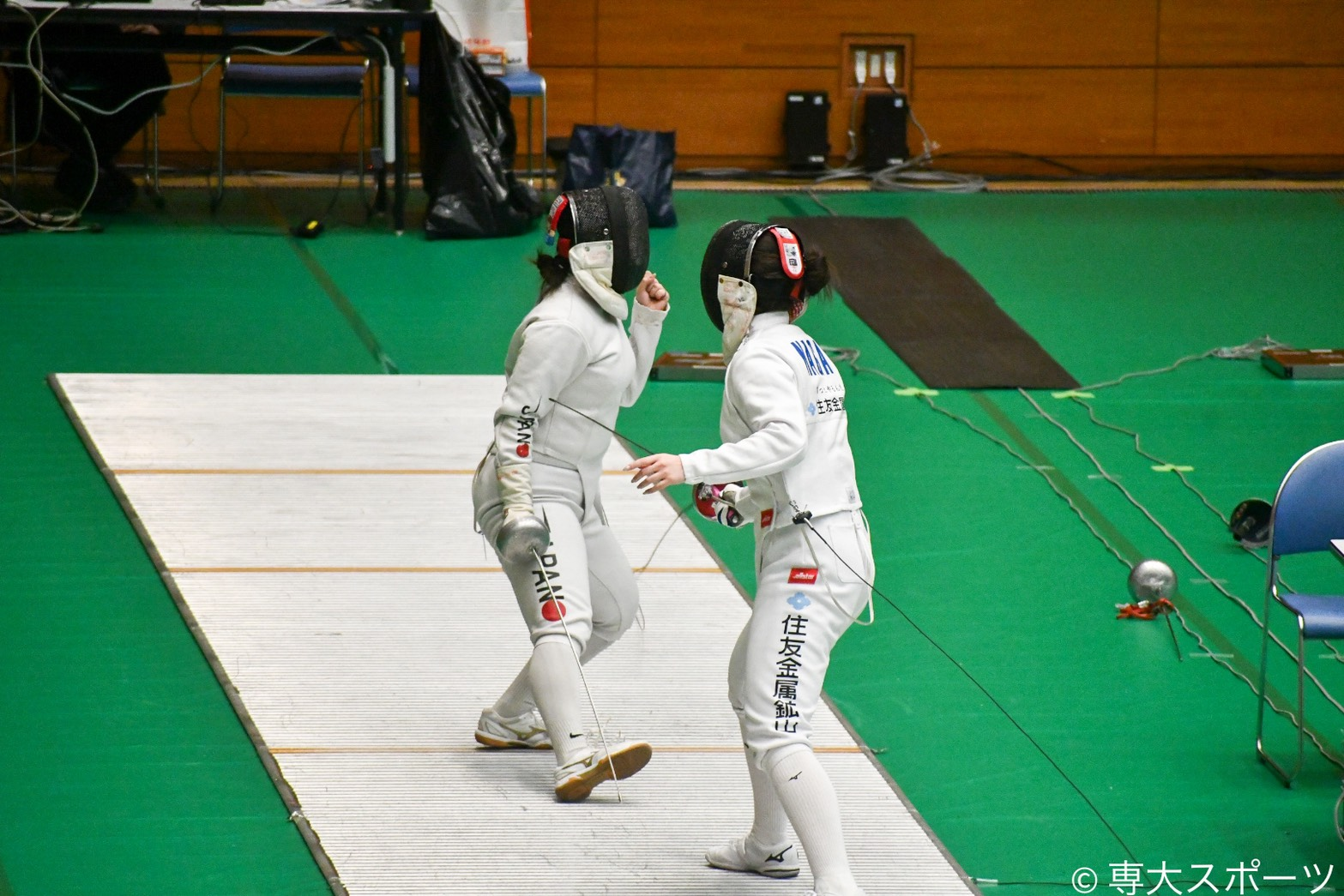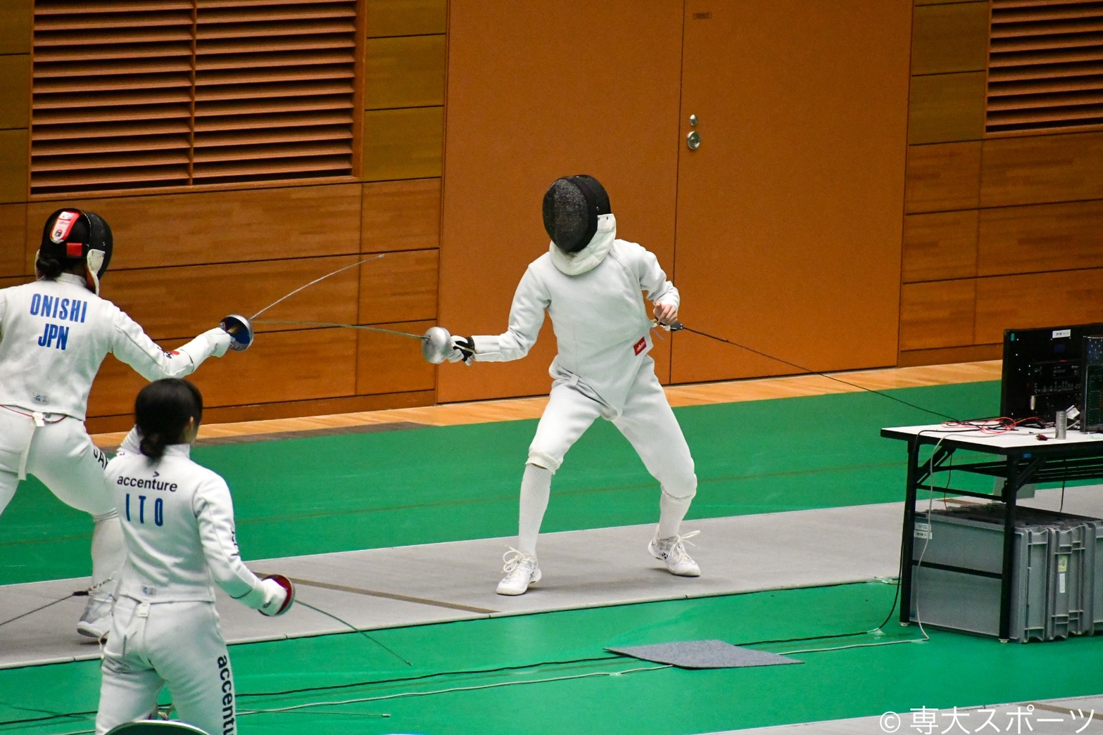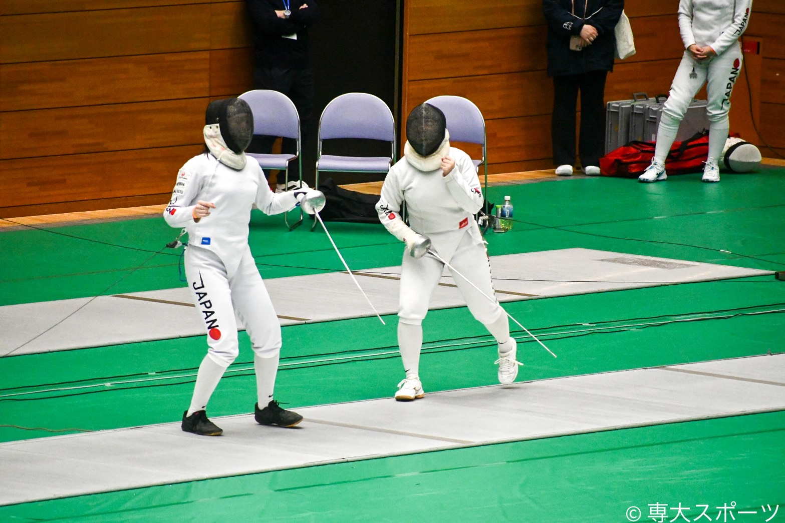 国内最高峰の全日本選手権(個人戦)が行われ、専大から3選手が女子エペに出場した。吉田ひなた(人間科学4・気仙沼高)、平西桜子(経済4・金沢西高)の4年生2人は、大学ラストマッチに臨んだ。両選手ともにトーナメント戦に進出すると、しのぎを削ってきた最大のライバル、明大の選手と対戦した。2選手は要所で粘りを見せたが、吉田は2回戦、平西は初戦で敗れ、大学競技生活に終止符を打った。
