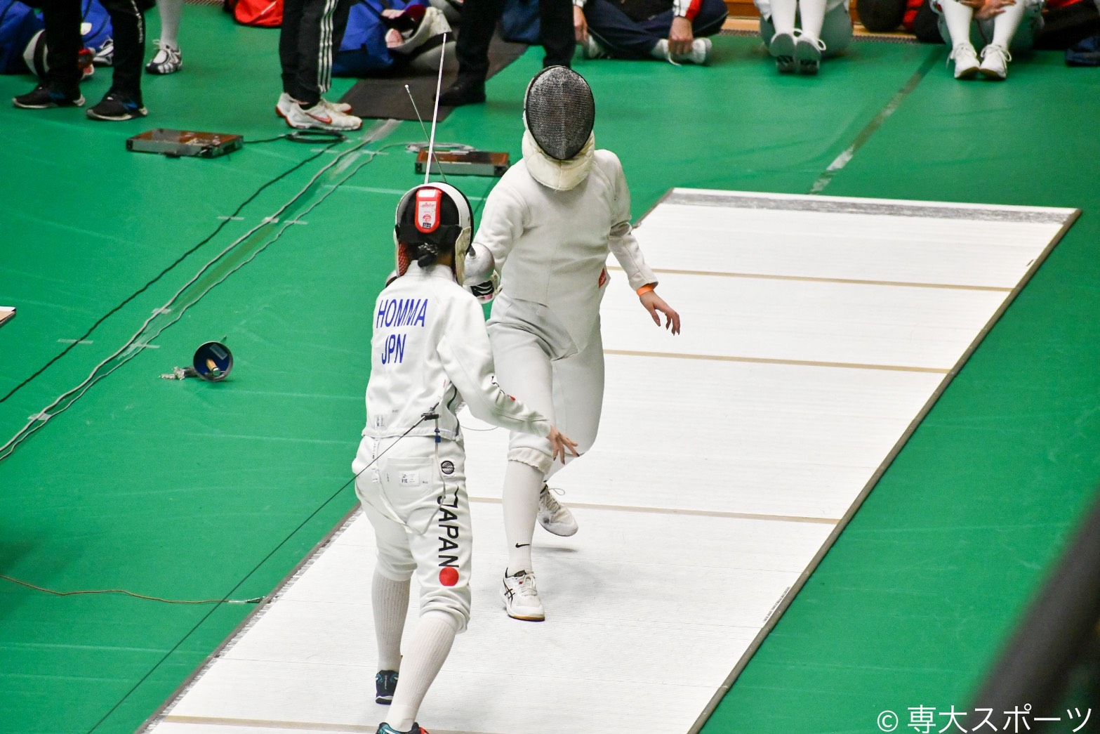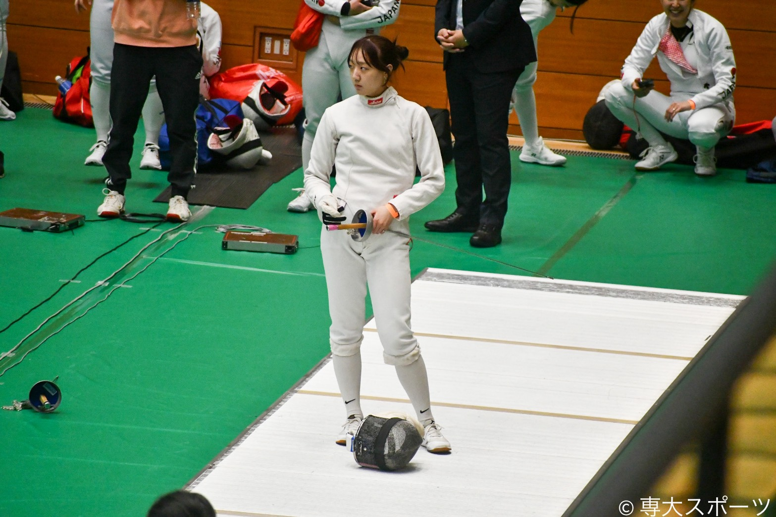 トーナメント初戦では、本間美月選手(明大)と対戦。難敵のレフティーを相手に、間合いを詰めすぎないよう自らアクションを起こすことを意識した。「自分の中で納得がいく点数を決めることができた」と話すように善戦したが、12対15で黒星を喫した。