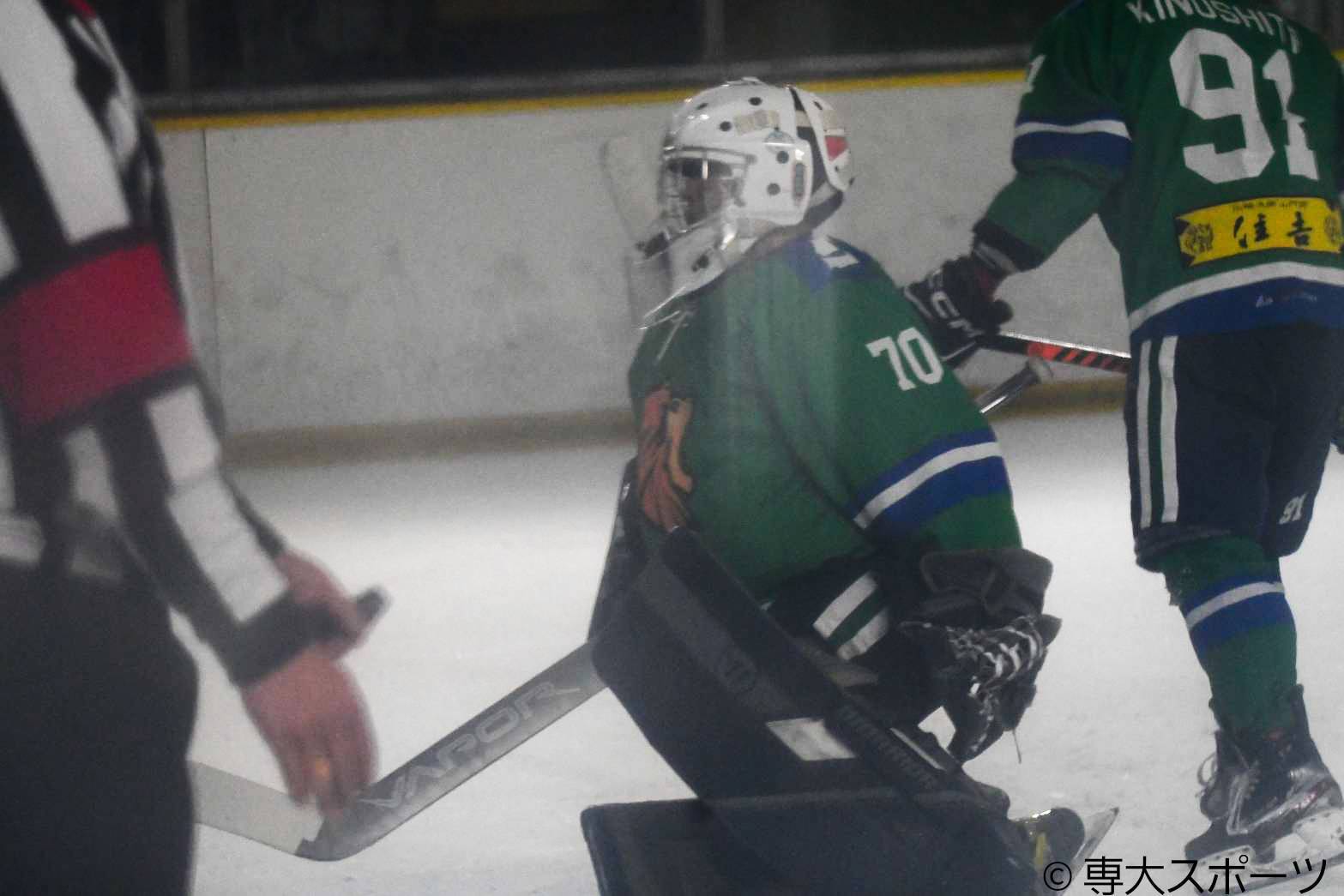 第1ピリオド(1P)はリンク全体を大きく使い、攻防が繰り広げられた。メンバーたちの体を張ったプレーやGK#70小倉康生(商3・釧路工業高)の好セーブで、相手に点を入れさせない。それでも、互いに点を決められない中で12分22秒に相手に先制点を与えてしまう。その後も追加点を許してしまい、早大が3点リードの状況で1Pを終えた。