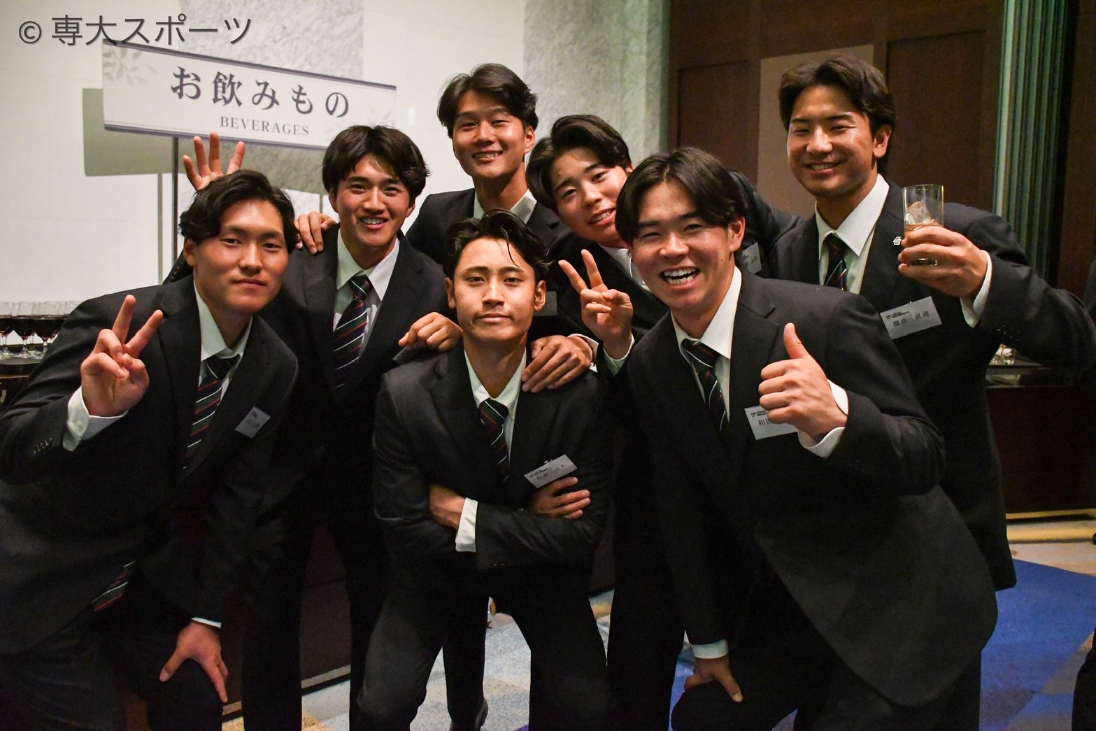 ▲左から吉田大馳(経済1・徳島商業高) 、岡江伸英(経営1・大阪桐蔭高)、下原口仁(経営1・鹿児島実業高)、松永昂大(経済1・熊本工業高)、一瀬友希(文1・藤枝明誠高)、和田琉汰(文1・静岡高)、櫻井直道(文1・松商学園高)