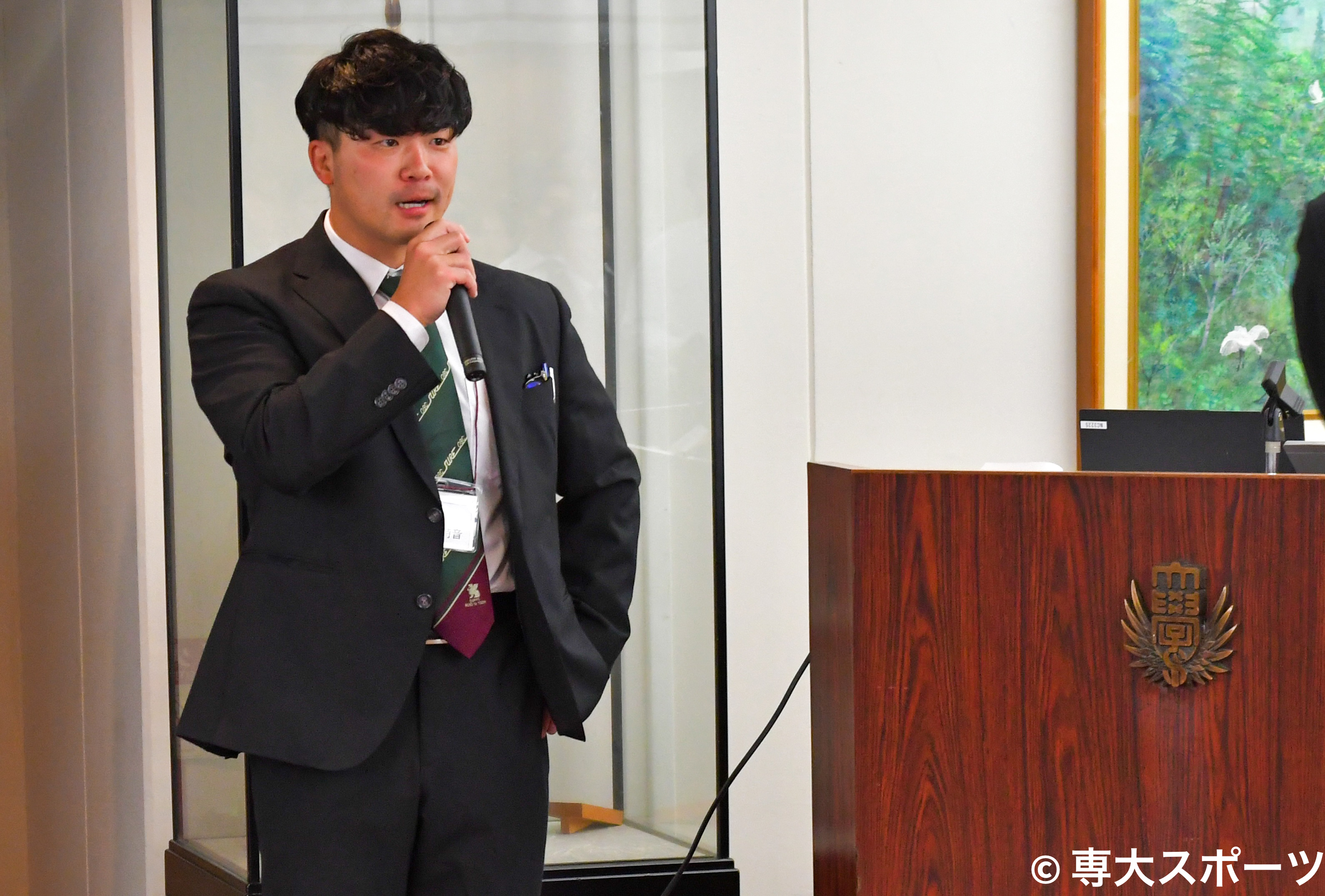 「こんにちは。麻雀部部長の岩間です。自分は麻雀に狂わされた4年間だったんですけど、(麻雀を)やっていたから仲良くなれた後輩もできたので、そこは良かったです。ラグビー部は1部に上がったので、あまり迷惑かけないように両立して頑張ってください。ありがとうございました」