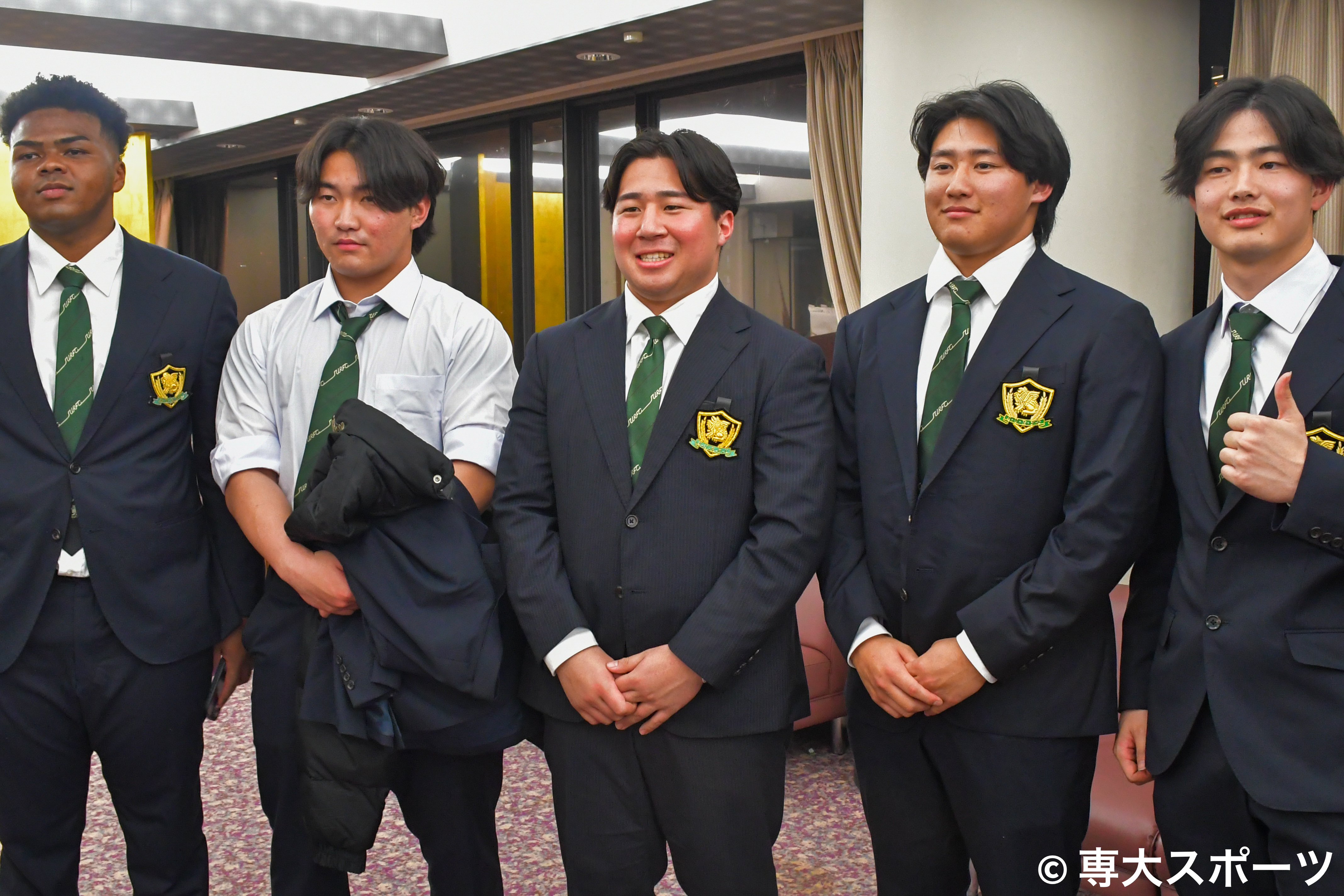 左から、藤間悠太(経済1・常翔学園高)、中島優大(文2・開志国際高)、井上晴輝(経営4・東福岡高)、丸山敬太(文4・桐蔭学園高)、原小太郎(経営4・桐蔭学園高)