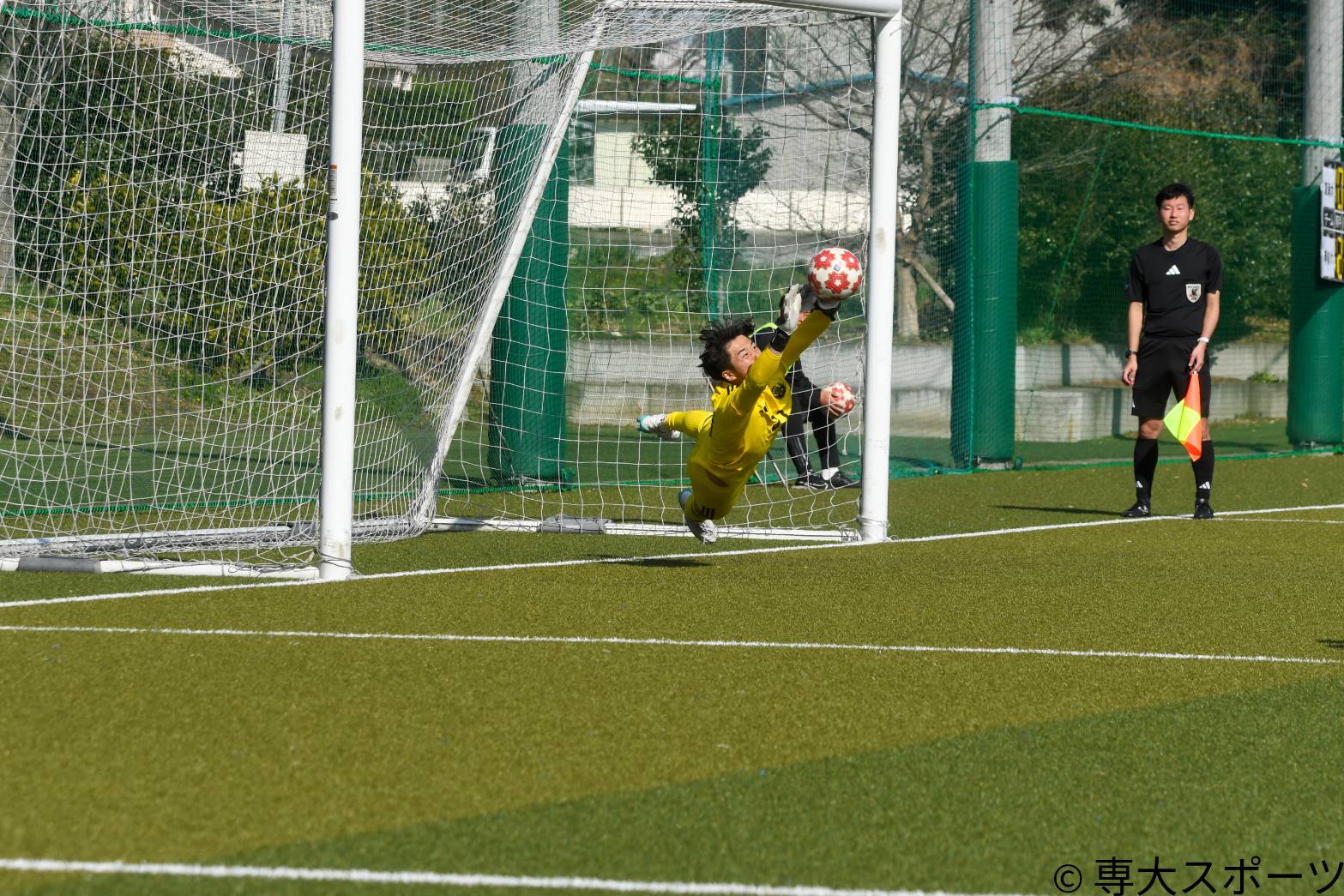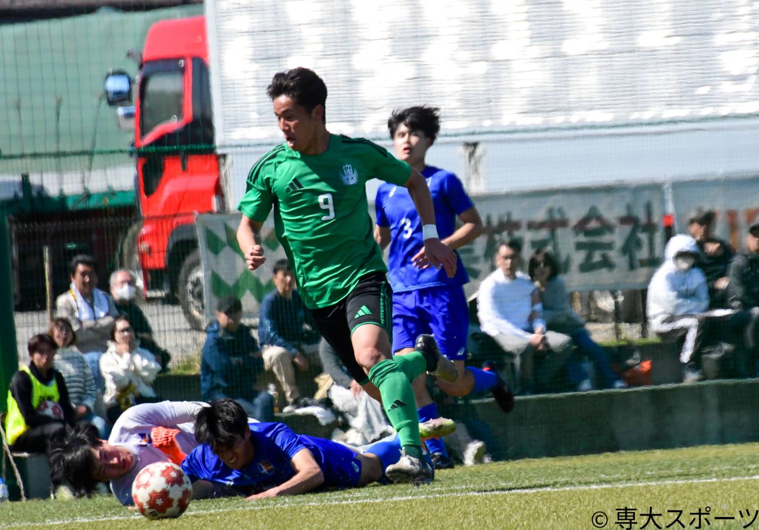 前半、専大は直近の試合の課題である立ち上がりの試合運びを修正し、東海大とボールを握り合う展開となる。互いに譲らない試合展開を見せるが、前半26分にGKの上林が前線にロングボールを供給すると山下が反応。相手DFとGKの連係ミスを逃さず、無人のゴールへ流し込み、先制に成功する。