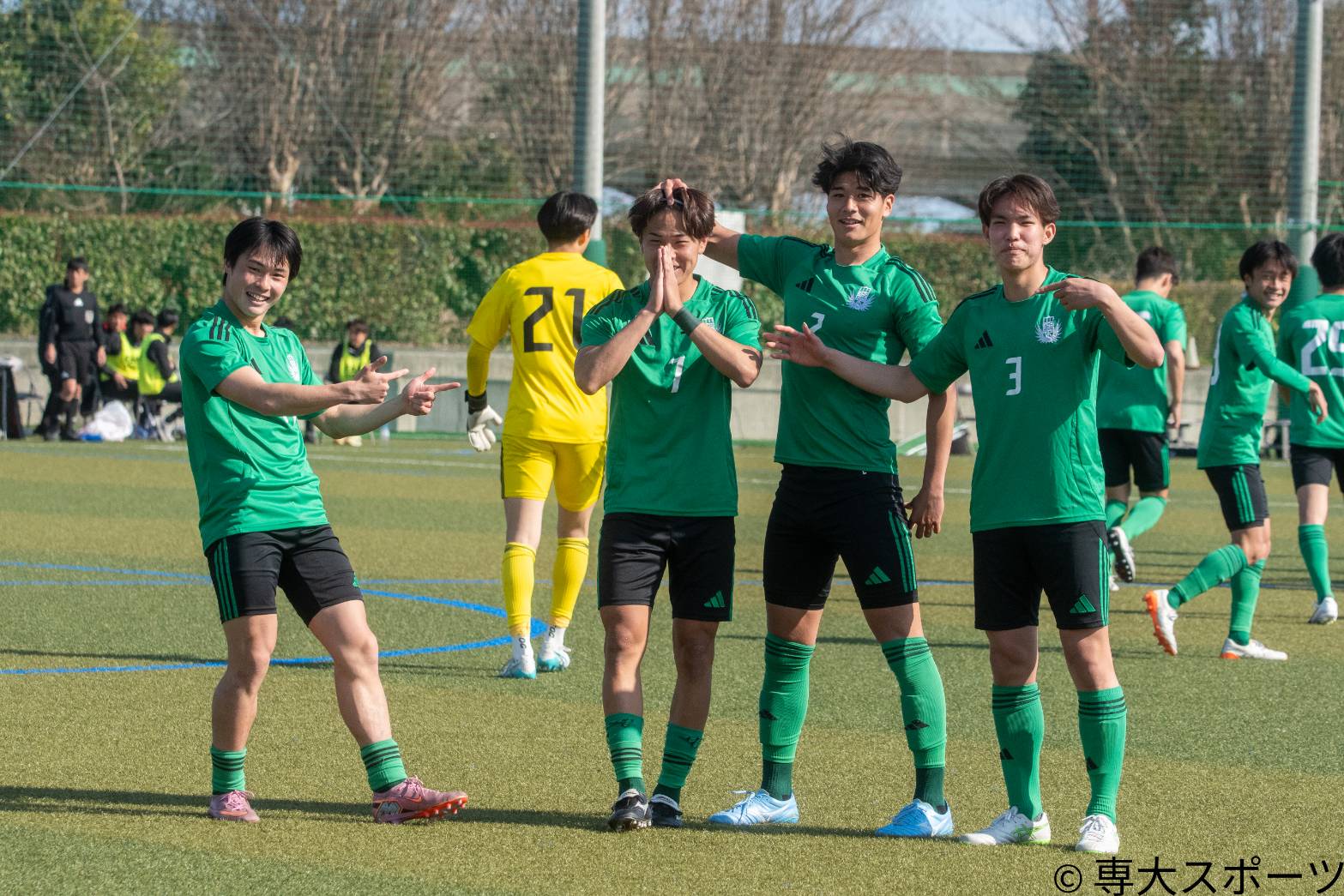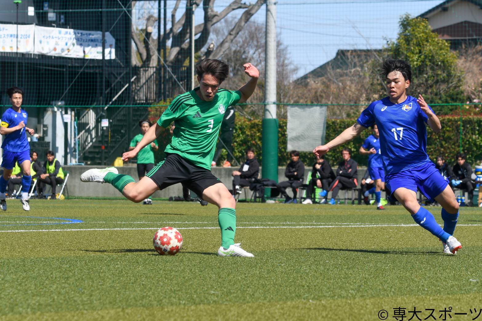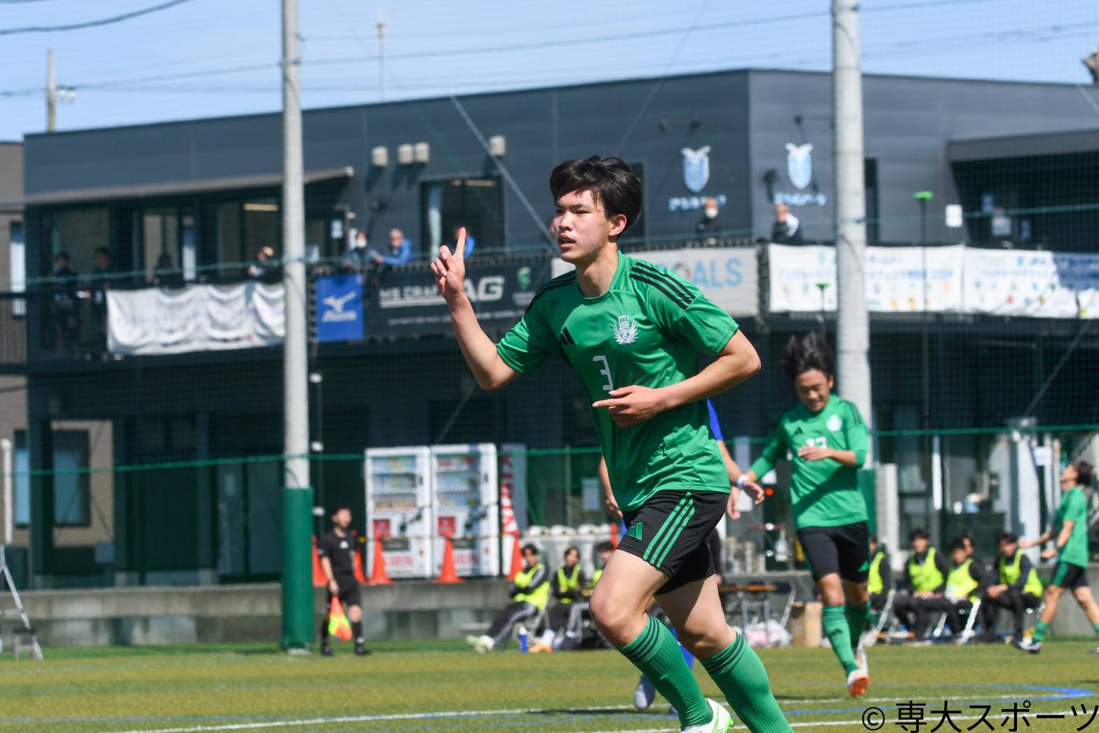 相手に決定機をほぼ作らせずに試合を折り返した専大は、後半も変わらず流動的な攻撃で東海大ディフェンスを脅かす。後半4分には、道白が中央でドリブルを仕掛け、右サイドの那須へパス。受けた那須のシュートは相手GKにキャッチされるも、シャドーの2人が継続して攻撃に絡む。後半11分には、ボランチの小林、左WBの志村を筆頭にダイレクトパスを6本回す攻撃で、東海大を翻弄する。後半22分に相手にスローインの流れから1点を返されるが、その4分後に専大は追加点を挙げる。佐藤漣と山下が相手陣に押し込むとこぼれ球を志村がダイレクトシュート。相手GKも見送るしかない一撃が、右ポストをかすめてネットに突き刺さり、3点目を獲得する。今季から左WBに入る主将は「こぼれ球が自分の前に転がってきた。(プレーの)移動中には(左足を)振ると決めていた。思い切って狙って、自分のイメージ通りのシュートだった」とゴールを振り返った。