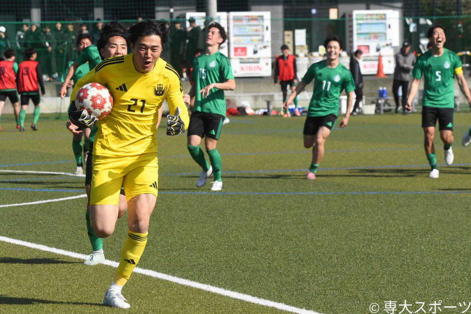 PK戦先攻の専大1人目は志村。ゴール右隅を狙うが相手GKにストップされる。ただ、東海大1人目のシュートを上林が止めてリードを許さない。東海大の2人目が外し、その後は両軍決め続ける。4人目のキッカーでは上林にとって昌平高校出身同士の対決も見られた。決めれば勝利の状況で5人目のキッカーは道白。パネンカで右上を狙うがポストに嫌われる。東海大5人目が決めて、サドンデスへもつれ込む。続く6人目の佐藤漣が左下に沈めると、東海大6人目を上林が右手を伸ばしてセーブ。上林はボールを抱えながら、駆けてきた専大イレブンと喜びをあらわにした。PK戦にもつれる激闘の末、専大が5年ぶりに3回戦へ駒を進めた。